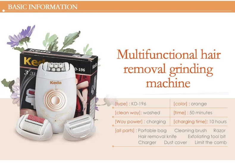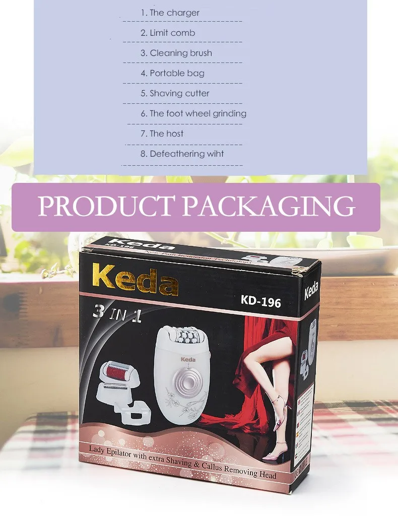 Thiết kế mới nhất cuả hãng KEDA dành cho các chị em phụ nữ - máy nhổ lông KEDA KD-196. KEDA KD-196 được thiết kế trang nhã tinh tế thanh lịch với 3 chức năng chính quan trọng mà chị em cần là: cạo , nhổ, chà gót chân.