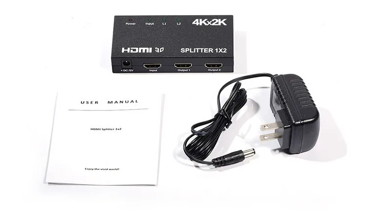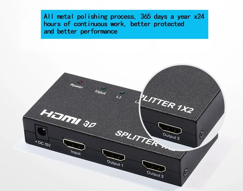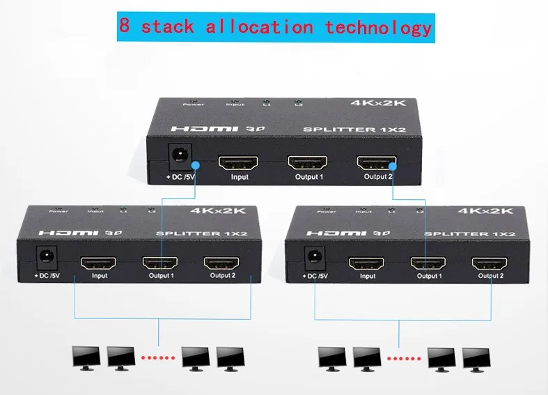 Bộ chia 1x2 hdmi splitter sử dụng một nguồn HDMI duy nhất, việc tiếp cận với nhiều đường HDMI. nó cho phép một thiết bị HDMI để được chia dễ dàng để bốn HDMI tương thích màn hình hoặc máy chiếu. In ngoài ra,nó cũng có thể được đặt ở những kết thúc của một dài HDMI cable để tái tạo các tín hiệu HDMI. Độ phân giải của thiết bị hdmi splitter có thể được lên đến 3840X2160/30 HZ.